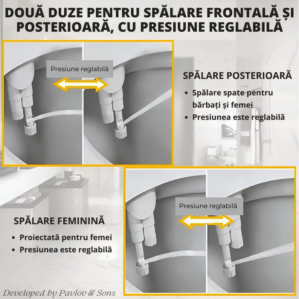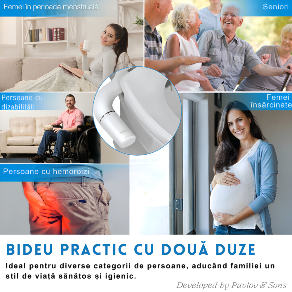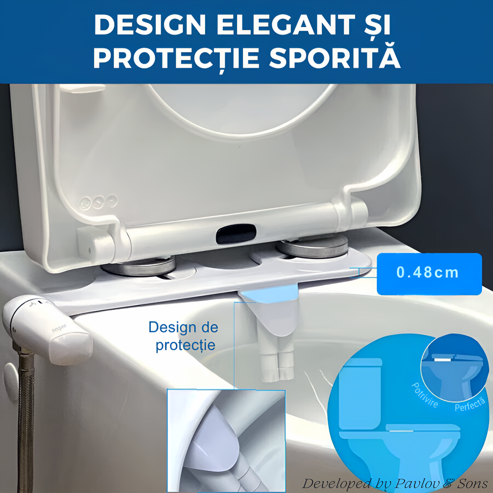 Cu un design ultra-subtire, bideul se monteaza discret sub capacul toaletei, economisind spatiu si integrandu-se perfect in orice baie. Culorile alb si argintiu adauga un aspect modern si elegant, iar functionarea non-electrica face din acest bideu o optiune economica si prietenoasa cu mediul. In plus, reduce semnificativ consumul de hartie igienica, protejand mediul si scazand costurile. Ideal pentru persoanele cu probleme de sanatate, cum ar fi hemoroizii, sau pentru cei care au nevoie de o igiena mai delicata, acest bideu este o alegere excelenta pentru femeile insarcinate, varstnici sau persoanele cu mobilitate redusa.