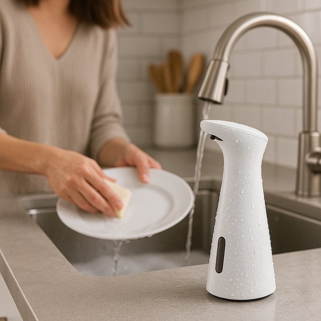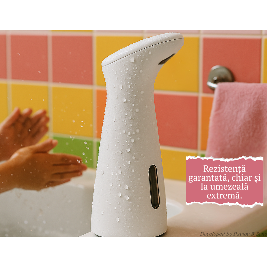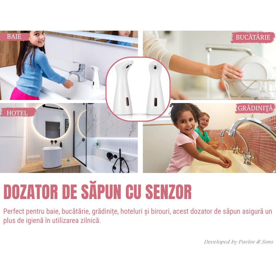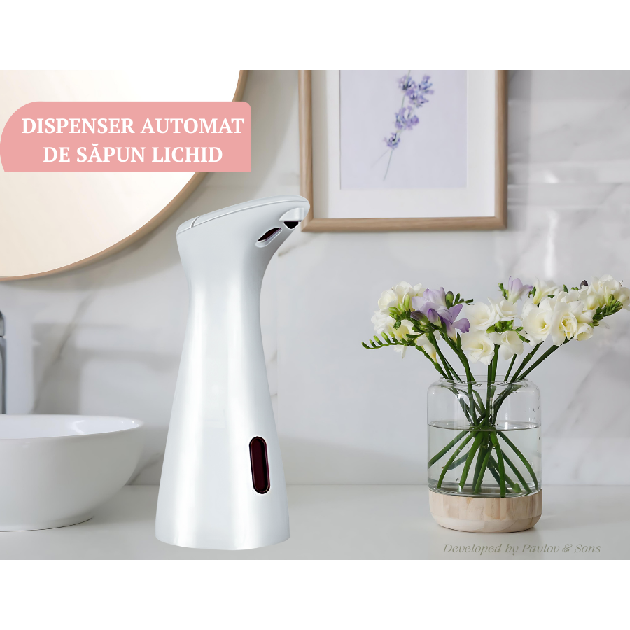 Alimentat cu 4 baterii AA, distribuie sapun lichid, gel de dus, detergent de vase, gel antibacterian rapid si precis. Design modern, rezistent la stropire, este ideal pentru baie, bucatarie sau spatii comerciale.
