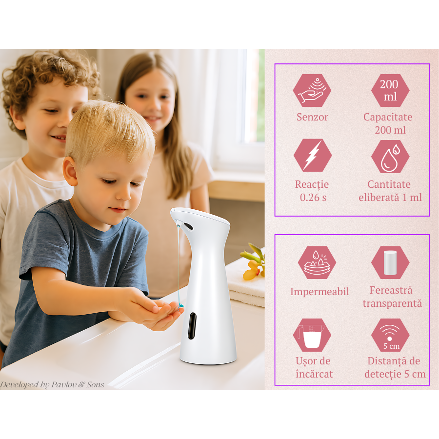 Igiena fara atingere – senzorul infrarosu detecteaza mana si elibereaza aproximativ 1 ml de sapun lichid, reducand riscul contaminarii.
