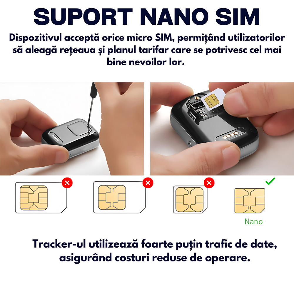 Poziționare Tripla: Dispozitivul utilizează tehnologiile GPS, LBS (rețele GSM) și WiFi pentru a asigura o precizie a localizării de 5-15 metri, oferind date exacte indiferent de locație.