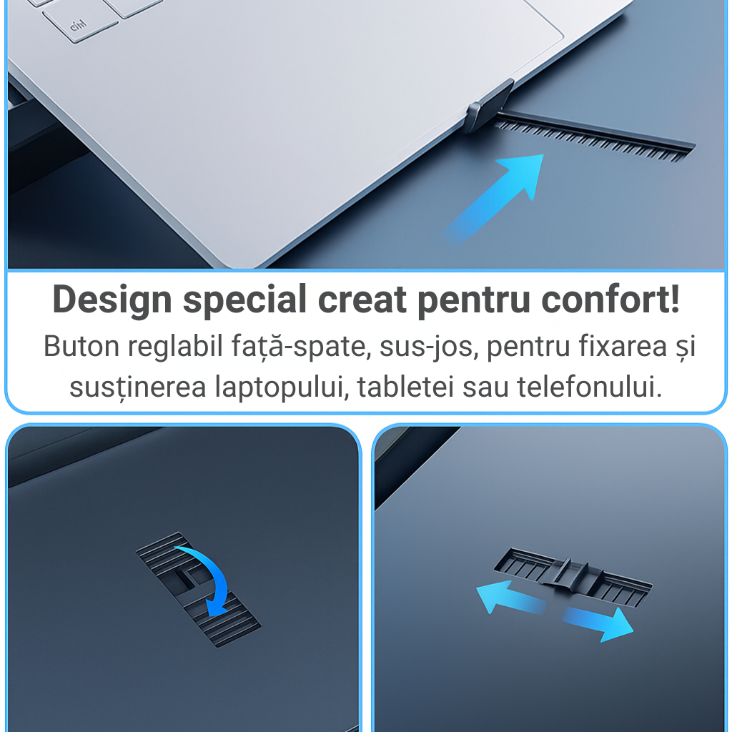 - Design special pentru confort – buton reglabil fata-spate si sus-jos, care fixeaza si sustine in siguranta laptopul, tableta sau telefonul.