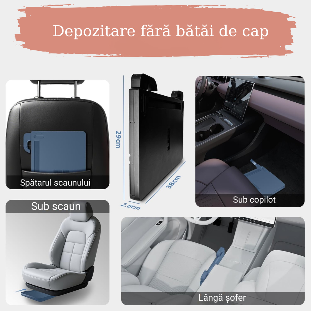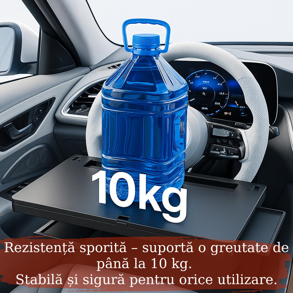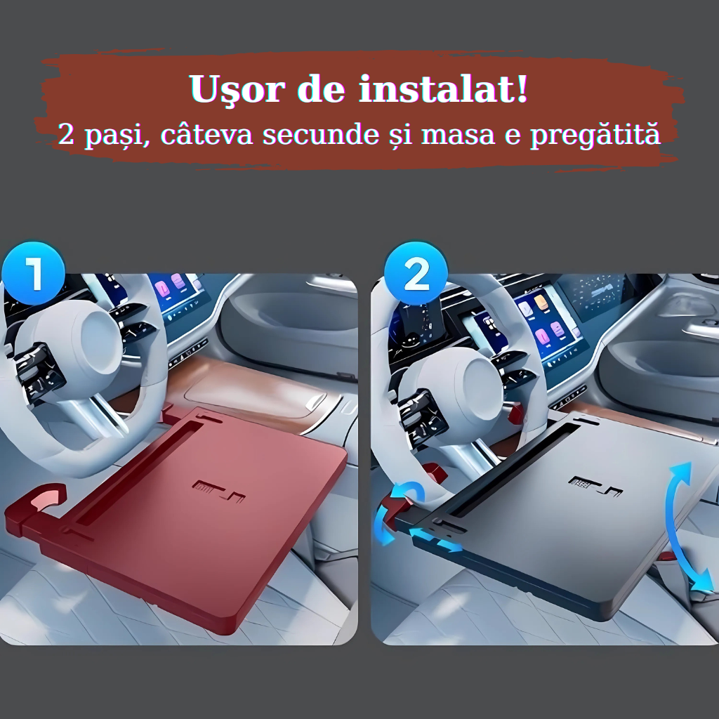 - Se monteaza in cateva secunde pe volan si iti ofera o suprafata stabila si sigura pentru laptop, tableta, telefon, bauturi sau chiar o masa rapida.