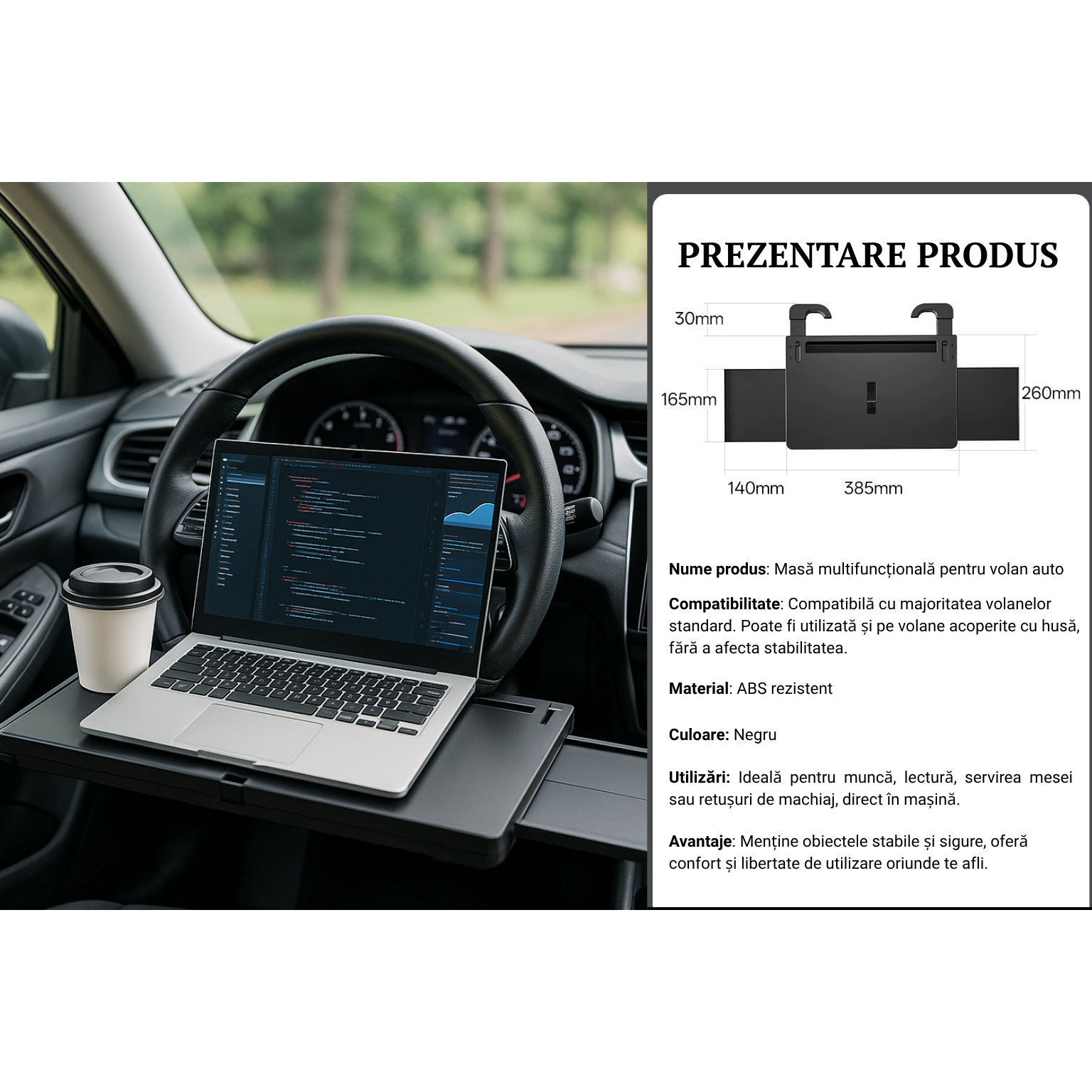 - Aceasta masa extensibila pentru volan este solutia ideala pentru soferi, freelanceri, agenti de vanzari, parinti in drumuri lungi sau pentru oricine petrece mult timp in masina.