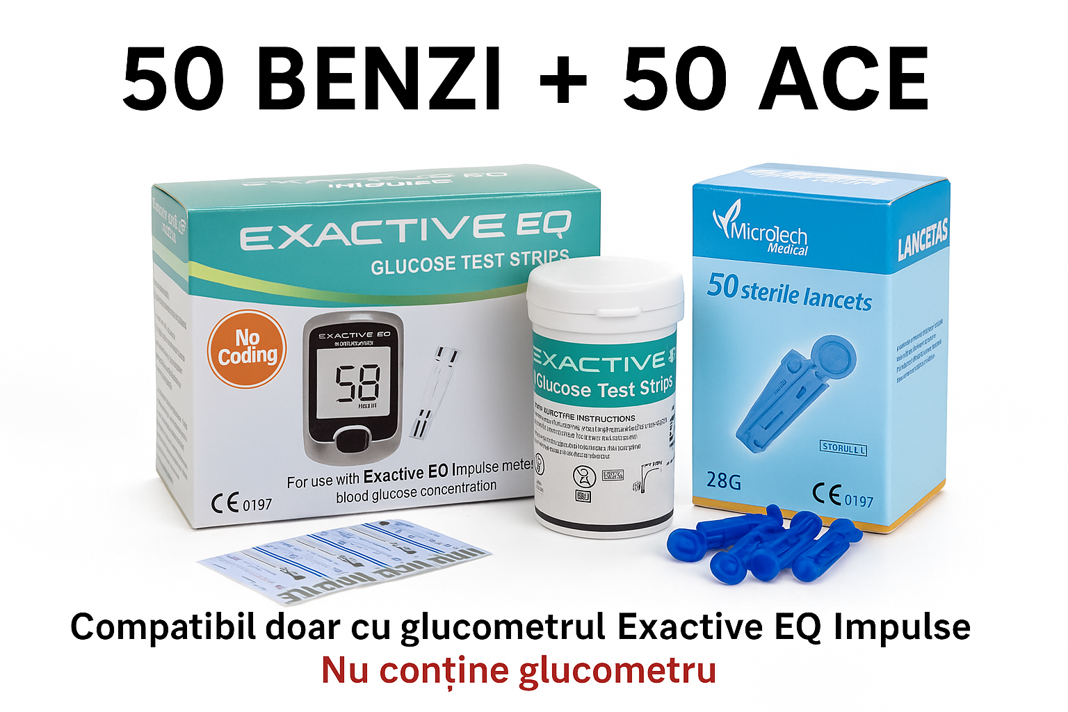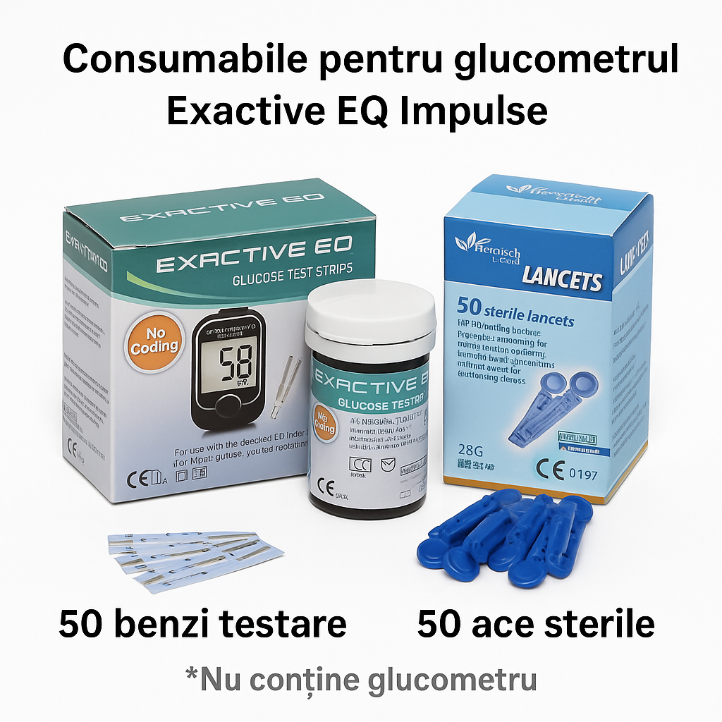 Set de 50 benzi si 50 ace, special conceput pentru glucometrul Exactive EQ Impulse. Compatibilitate 100% garantata. Ofera rezultate rapide si precise, fara codare, cu un volum minim de sange. Ideal pentru monitorizarea zilnica a glicemiei.